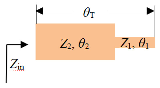 The stepped impedance resonator (SIR) structure has been reported in the design of bandpass filters, duplexers, and metamaterial unit-cell [27,28,29,30]. The SIR is a cascade of high impedance and low impedance transmission lines. The high impedance line acts as a series inductor, and the low impedance line acts as a parallel capacitor. The SIR resonator controls the harmonic frequency corresponding to the frequency response by adjusting the impedance ratio and the length of the resonator to compensate for the unequal phase velocity of the odd mode and even mode. A wider resonance frequency band can be obtained based on the structure. In Figure 2, both terminals are at the open state and are formed by two microstrip transmission lines. The two microstrip transmission lines have different characteristic impedances (Z1 and Z2) with the electrical length θ1 and θ2, respectively. The two microstrip transmission lines have different characteristic impedances and have different electrical lengths, respectively. If the effect of step discontinuity is ignored, the basic resonance condition of SIR can be derived from the input impedance of the opened terminal, which can be written as [31]: