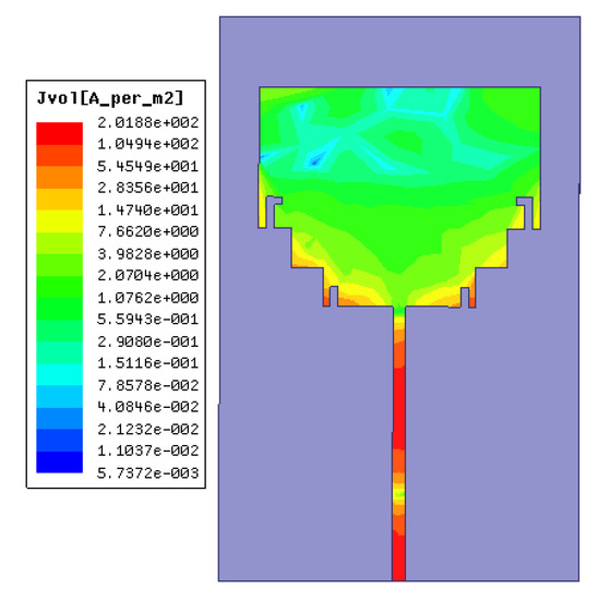 The structure shown in Figure 1 is designed and simulated by using Ansoft’s High-Frequency Structure Simulator (HFSS) software. First of all, the rectangular patch antenna is designed on a 36 mm × 23 mm Rogers 4350 substrate. The width of the feed line is 1.07 mm (w). Figure 3 is the simulated antenna surface current magnitude distribution. It can be seen that the intensity of the current amplitude along the edge of the slot is significantly enhanced. The reflection coefficient curve of the simulation is shown in Figure 4. The impedance bandwidth with the reflection coefficient of less than −10 dB is very narrow. The operating frequency band is from 2.03 GHz to 4.75 GHz. The bandwidth is only 2.62 GHz, and the minimum reflection coefficient is only −18 dB in the band.