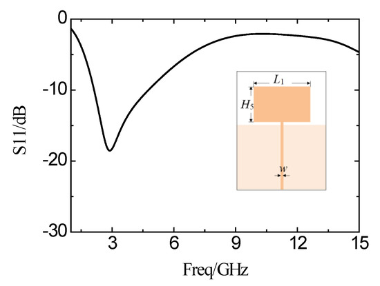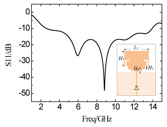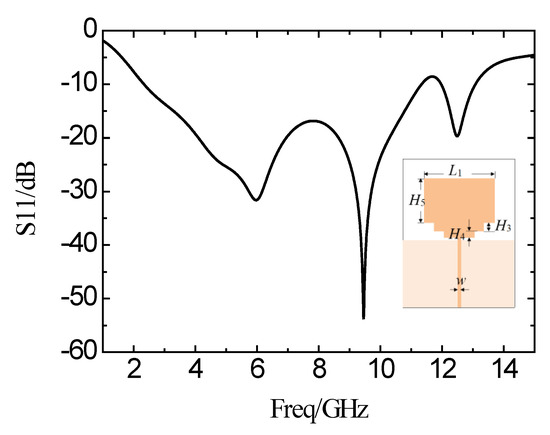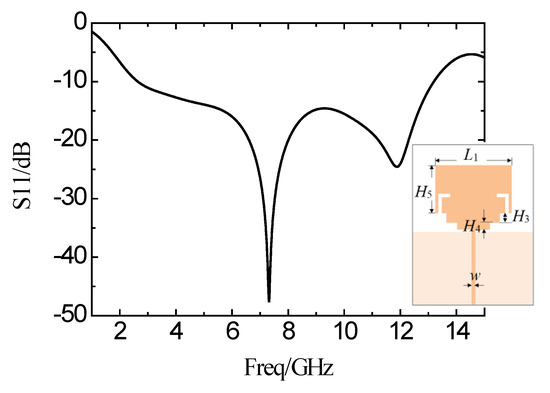 In order to expand the bandwidth and to make a good transition between the radiation patch and the feed line, the SIR microstrip structure is added between the radiating patch and the feed line. Figure 5 shows the simulation curve of the antenna reflection coefficient with SIR structure. The operating frequency band is from 2.4 GHz to 11.29 GHz, with a reflection coefficient of less than −10 dB. The bandwidth is 8.89 GHz. Two zero points appear in the passband. The bandwidth is increased, and the characteristics are improved in the band.