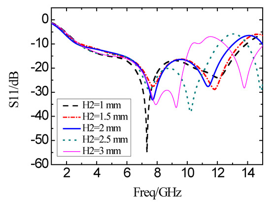 The effects of different structural parameters with L-shaped and I-shaped slots are simulated in terms of the reflection coefficient. The simulation results of the reflection coefficient with varied structures are shown in Figure 8, with the changing of the length H2. It can be seen that H2 is insensitive at low-frequency, while very sensitive at high-frequency. When H2 increases from 1 mm to 3 mm, the 10 dB impedance bandwidth decreases.