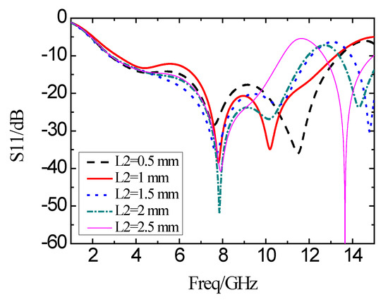 When the length L2 of the other side of the L-shaped slot is varied from 0.5 mm to 1.5 mm, the simulation results of the reflection coefficients are as shown in Figure 9. With a decrease in L2, the impedance bandwidth is broadened. But the in-band characteristics are degraded with an increase in L2. At the same time, the impedance bandwidth is narrowed, and the in-band characteristics are improved.
