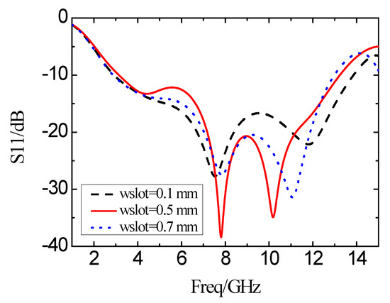 Figure 10 shows the simulation results of the reflection coefficient curve of the antenna when the widths wslot of the L-shaped slot are 0.1, 0.5, and 0.7 mm, respectively. As the width of the L-shaped slot is increased, the bandwidth is narrowed, and the in-band characteristics are improved. When the slot width is decreased, the bandwidth is increased accordingly. Meanwhile, the in-band characteristic is degraded.
