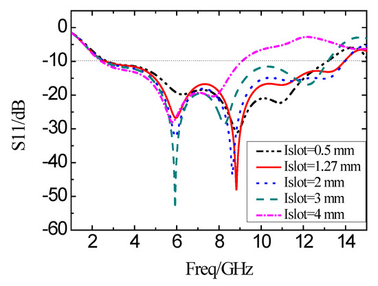 When the distance of the I-shaped slot from the center of the feed line is fixed to be 3.91 mm, the length of the I-shaped slot is varied. The corresponding simulation results of the reflection coefficient are shown in Figure 11. With the increase in the length (Islot), the bandwidth decreases. Meanwhile, the characteristics deteriorate in the operating band. In this manner, the length of the I-shaped slot should be smaller than the height (H4) of the SIR microstrip to avoid the obvious degradation of the bandwidth.