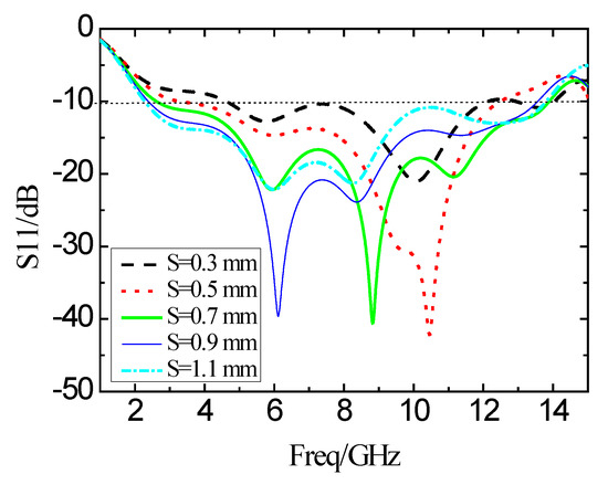 The structural parameter S in Figure 1 is the distance between the radiation patch on the top layer of the substrate and the ground plate on the back of the substrate, which is mainly for the good broadband matching performance. Figure 12 shows the reflection coefficient results when S changes from 0.3 mm to 1.1 mm in the step of 0.2 mm. When the value of S is less than 0.7 mm, the bandwidth decreases, and the in-band characteristic deteriorates sharply. When the value of S is greater than 0.7 mm, the bandwidth is slightly reduced, but the in-band characteristics may become unsatisfactory. Therefore, when the value of S is equal to 0.7 mm, the performance of the antenna is the best.