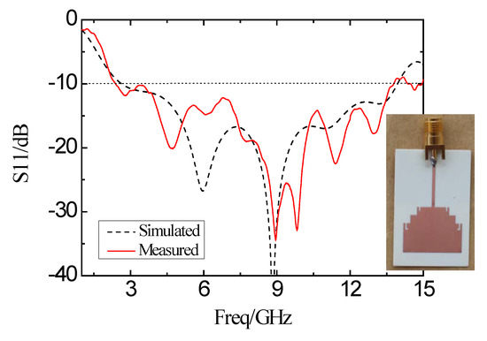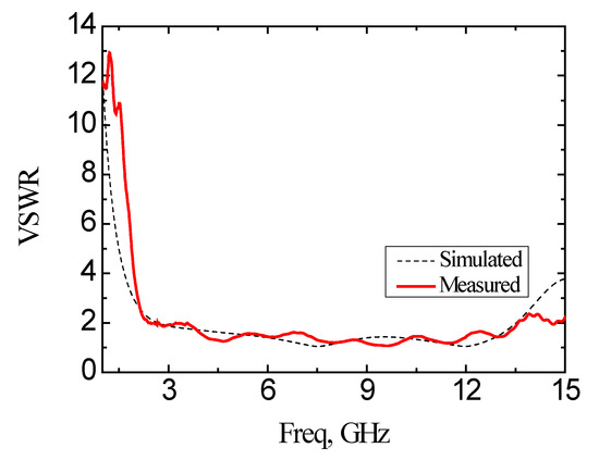 The antenna is fabricated and measured after optimizing the structure. Agilent’s vector network analyzer (VNA) (model: Agilent E8362B, Keysight, Santa Rosa, CA, USA) is used to measure in the anechoic chamber. Figure 13 shows the simulated and experimental measured results of the reflection coefficient based on the designed antenna. The frequency band with the reflection coefficient smaller than −10 dB is from 2.64 GHz to 13.93 GHz based on the simulation result. Based on the experimental measurement, the band with the reflection coefficient of less than −10 dB is from 2.39 GHz to 13.78 GHz with the bandwidth of 11.39 GHz. The frequency bandwidth for VSWR < 2 of the simulation is from 2.67 GHz to 13.52 GHz, and the measured frequency band is from 2.39 GHz to 13.57 GHz, as shown in Figure 14.