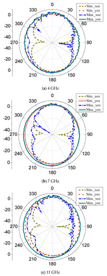 Simulation and measurement radiated pattern on xoz plane and yoz plane, respectively. (a) 4 GHz, (b) 7 GHz, (c) 11 GHz.