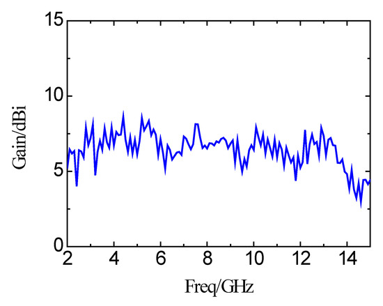 To further broaden the operating band and improve the characteristics in-band, two symmetric L-shaped slots are implemented on the side of the rectangular patch. The simulation curve of the reflection coefficient is shown in Figure 6. The frequency is from 2.78 GHz to 13.16 GHz, while the reflection coefficient is less than −10 dB. The bandwidth is broadened by 10.38 GHz so far.