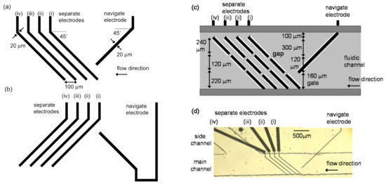 The electrode pattern was fabricated on a glass slide by the conventional photolithography and Ti and Pt sputtering. Figure 1a,b shows the designs of the bottom and top substrates with Pt electrodes, respectively. The navigate electrode with 20 μm wide was set 45° against the flow direction. The angle of four separate electrodes with 20 μm wide were oppositely arranged at 45°. Each separate electrode was arranged with 100 μm gaps. The length of the navigate electrode and separate electrodes were set at 600 μm and 820 μm, respectively. The substrates were covered with negative photoresist (SU-8 3002, MicroChem Corp., Newton, MA, USA) except the electrodes. Figure 1c shows the bottom substrate covered with the insulating layer which was colored by the light gray. Importantly, two gaps that were regions covered with the insulating layer (20 × 20 μm), were provided on each separate electrode. Double-sided adhesive films (regions colored by the dark gray in Figure 1c) with 50 μm thick (Nitto Denko Co., Osaka, Japan) was arranged on the bottom substrate to define the fluidic channel. The insulating layer with same design for the bottom substrate was also prepared on the top substrate. Then, the top substrate was mounted on the bottom substrate with the correspondence to each electrode on both top and bottom substrates. Two gaps on separate electrodes (i) and (iii) were provided on regions of 160 and 280 μm from the edge of the lower side of fluidic channel (Figure 1c). Two gaps for separate electrodes (ii) and (iv) were also provided on regions of 220 and 340 μm. Figure 1d shows the image of the bottom substrate with film for the main and side channels with 680 μm width. An inlet was prepared on the right end of the main channel, and two outlets were also prepared on the left end of the main channel and the end of the side channel by drilling on the upper substrate. Cells flowed from the right side of the main channel. Electric fields for the DEP force were formed between electrodes on the upper and bottom substrates, because the navigate and separate electrodes were directly exposed to the solution due to the removal of photoresist.