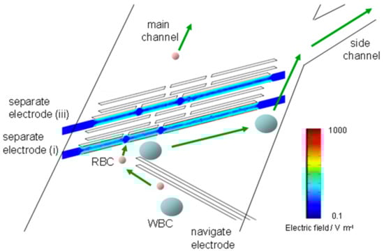 The distribution of the electric field strength for the separator in the device was calculated by the finite element method (FEM) solver (COMSOL MultiphysicsTM, Stockholm, Sweden). Figure 2 shows cross-sectional plots of electric fields along centers of the separation electrodes (i) and (iii) when a potential difference (14 V) is applied to the pairs of the top and bottom electrodes for the separation electrodes (i) and (iii). The navigation and separation electrodes are represented by the white rectangles in Figure 2. The distance between the pair of electrodes was set at 55 μm. Both cells direct to the edge without side channel along the navigation electrodes by the repulsive force of n-DEP generated by the navigation electrodes, resulting in the accumulation at the edge (left edge in Figure 2). The both cells reached at the separator (i) are again repelled and deflected to another edge of the channel with same manner. Relatively strong electric filed is generated between the separation electrodes, while relatively low electric field region appeared in the regions at the gaps colored with blue in Figure 2. When hydrodynamic force for the cells is larger than repulsive force generated by n-DEP at the gaps, the cells will flow downstream through gaps. On the other hand, when the cells experience the strong repulsive force at the gaps compared to the hydrodynamic force, the cells will be brought toward the edge with the side channel along the separator.