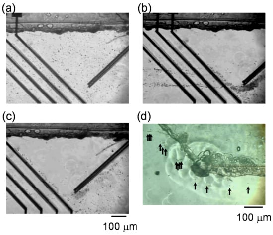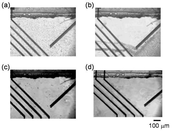 We previously reported the capture of cells in microwells with p-DEP [36,37] and the formation of cell aggregates by gathering cells with n-DEP [5]. Cells maintained the esterase activity and proliferation after cells were trapped in microwells to be exposed to the relatively strong electric field. Moreover, cells also maintained their viability even after cells were applied to the electric field generated by an AC voltage of 20 Vpp for 45 min to obtain the cell aggregations. In contrast, cells were only exposed to a relatively weak electric field by the repulsive force against the electric field for approximately 15 s. Thus, the cells used in the experiments would maintain the viability.