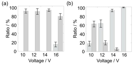 (a) Ratio of RBCs reached at upper edge in the channel (bar colored with light gray) and passed through the gaps on separator electrodes (i) (bar colored with gray); (b) ratio of THP-1 cells reached at upper edge in the channel (bar colored with light gray) and passed through the gaps on separator electrodes (i) (bar colored with gray).
