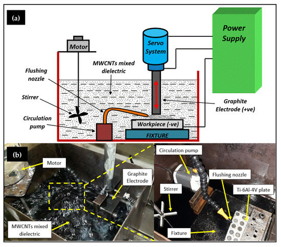 Various powders have been used by the researchers to investigate their machining performance and influence on the surface characteristics of the machined surface. The most commonly utilized powders are silicon, aluminum, chromium, silicon carbide, titanium, tantalum, boron carbide, and carbon nanotubes [15]. The selection of powder in the dielectric medium significantly depends on the final application of the product. For instance, carbon nanotubes exist in two variants, i.e., single-walled carbon nanotubes (SWCNTs) and multi-walled carbon nanotubes (MWCNTs). The MWCNTs are concentrically aligned sheets of graphene in the shape of cylinders having an outer diameter in the range of 20 to 50 nm [16]. These MWCNTs have been in the limelight in recent decades for exhibiting superior properties pertaining to chemical, electrical, mechanical durability, strength, and bioactivity [17,18]. As a result, carbon nanotubes prominently found applications in the area of medicine and biomedical industries [19,20].
