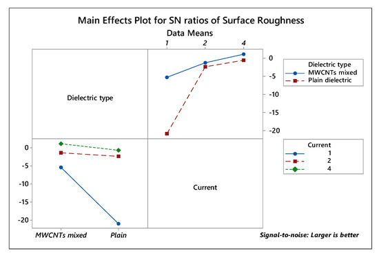 Similar results were revealed by the signal-to-noise ratio plot (Figure 2), disclosing dielectric type, current, pulse-on-time as momentous parameters, and pulse-off-time, voltage as insignificant parameters for the microhardness of treated samples. The higher intensity of the current and pulse-on-time steeply promotes the deposition of particles, which improves the microhardness, and other changes in surface characteristics of the machining area during the EDT process [37,38,39]. Based on the results, higher values of current (4A) and MWCNTs, mixed dielectric medium, depicts utmost mean microhardness (4452.5 HV, trial 17) with an increase of 2.5 times comparative to the sample treated in plain dielectric (1765.2 HV, trial 9), and 10 times superior to the untreated material (435.4 HV), respectively.