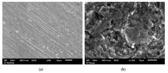 The supremacy of the carbon nanotubes mixed dielectric was investigated using scanning electron microscopy. Figure 5a,b manifests the morphological of untreated and treated substrate. For morphological examination, sample depicting superior microhardness and higher surface roughness (trial 17) was selected. It is evident from the micrograph (Figure 5b) that a higher spark energy, coupled with carbon particles, produce micro-macropores, small crests on the EDT surface. The existence of such pores, microcracks, and molten metal droplets on the surface facilitated good adhesion within the implant-bone interface, and offered cell growth for proper regeneration [42,43].