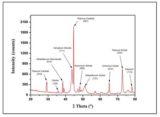 Furthermore, the investigation of the electro-discharge-treated sample with maximum microhardness and surface roughness was carried using an X-ray diffractometer within the range of 20°–80°. The XRD spectra in Figure 6 revealed the formation of various intermetallic compounds during the EDT process, which majorly contributes to improving the microhardness of the treated substrate. The newly formed compounds namely calcite (C1Ca1O3), titanium nickel (Ni1T1) shows the hexagonal structure, molybdenum germanide (Ge2Mo1), molybdenum nickel (Mo1Ni4) represents a tetragonal structure, and aluminium nitride (Al1N1), chromium oxide (Cr3O1) disclosed as a cubic structure. Alongside, high peaks of titanium carbide (TiC), vanadium silicide (Si2V1) were witnessed on the surface, and the presence of such hard-bioactive layers exhibits better resistance to corrosion, wear by providing appropriate implant-bone bioactivity within the individual. Moreover, the MWCNTs-EDT surface was further examined for the valuation of in-vitro behavior to affirm the enhanced wear resistance and corrosion resistance by comparing the results with untreated surface and the sample treated in the plain dielectric.