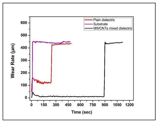 Figure 7 unfolded the combined wear plot for three samples, and it was observed that the wear of substrate was nearly at an even rate of 450 μm. The wear of sample, treated in the plain dielectric, started after 150 μm in the beginning, due to the presence of ridges, then the wear rate became constant to 125 μm (approx.) up to 250 s until the machined or recast layer wore off. Afterwards, the wear rate was raised to 440 μm, which was close to the wear rate of the substrate material. The wear of MWCNTs-treated sample started initially at 50 μm, and once the surface became even from all edges, a constant wear rate of 22 μm was exhibited by the MWCNTs-EDT sample up to 900 s. This wear response was due to the modified surface having intermetallic compounds, carbides, and silicide, as discussed in the section of XRD analysis. Later, the wear rate was abruptly raised once the coated layer wore out, demonstrating an improved resistance to wear by 95% compared to substrate metal.