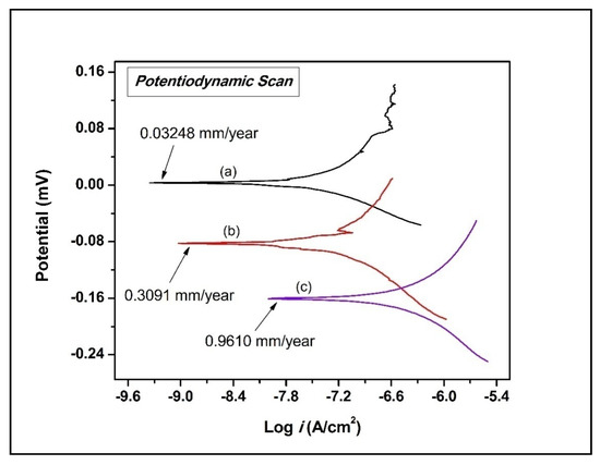 Combined polarization curves of samples (a) treated in MWCNTs, (b) treated in plain dielectric, (c) substrate.