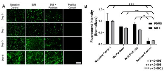 Cell viability on microrobot materials. (A) Fluorescent images taken of cell proliferation for four different test cases. Green fluorescent cells indicate living cells that have adhered to the well plate and are viable. Scale bar is 200 μm. (B) Cell viability was quantified utilizing a resazurin assay, normalized to the negative control (cell media) of the respective trials (SU-8 or PDMS). Significant differences were found between the negative control and positive control (*** p < 0.0001), no particles and positive control (** p < 0.001), as well as with particles and positive control (* p < 0.005) for both groups (SU-8 and PDMS).