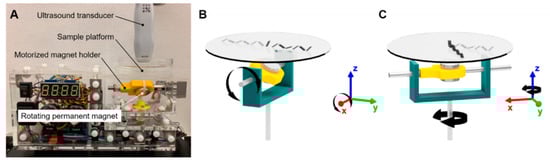 Real-time videos of the microrobots were acquired using a high-frequency ultrasound system (Vevo 3100, FUJIFILM VisualSonics, Toronto, ON, Canada) with the B-mode imaging setting. A linear array ultrasound probe (MX700) with a frequency range of 30–70 MHz and a central frequency of 50 MHz was used for ultrasound imaging. With this transducer probe, the depth or axial resolution is limited to 30 µm. A cylindrical NdFeB permanent magnet 2.54 cm (1″) in diameter and 2.22 cm (0.875″) in height (Cyl1875, SuperMagnetMan) was rotated at set frequencies of 0.5, 1.0, and 1.5 Hz underneath the sample using a two-degree-of-freedom motorized magnet holder, applying magnetic torque on nearby magnetized objects. The location of the microrobot during locomotion is roughly 3.81 cm (1.5″) above the magnet. Based on an analytical model of magnets with cylindrical symmetry [38], the magnetic flux density at the location of the microrobot is estimated to be 21.4 mT, although this value can fluctuate depending on the orientation of the magnet. Numerical simulations (COMSOL Multiphysics) of the magnetic field distribution estimate that the magnetic flux density due to the permanent magnet ranges from 12.5 to 19.4 mT (Table S1). Continuous, reversible tumbling motion in a 180° arc is possible, allowing the microrobot to be manipulated to any location on the planar sample space. Figure 4 illustrates the test setup and the degrees of freedom of the motorized permanent magnet manipulator. Major dimensions and components are detailed in Figure S6. The locomotion tests were conducted in ex vivo, in vitro, in situ dissected, in situ intact, and in vivo conditions to quantify microrobot performance in various biological settings.