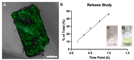 A payload coating process was performed on the microrobots and examined the payload’s diffusion over time to investigate the potential of functionalizing the microrobots for drug delivery applications. Coating of the microrobots was completed via electrospraying them with a solution consisting of dimethylformamide (DMF), chloroform, poly(lactic-co-glycolic acid) (PLGA), and fluorescein. The drug diffusivity value is constant based on the polymer release of the mock drug payload. The circular cutouts allow for an increased surface area for the polymer to be coated on. This provides for an increased polymer and drug loading of about 3.50%, however, the rate of diffusion would remain the same. The fluorescing microrobot in Figure 6A indicated a successful payload application on microrobots.