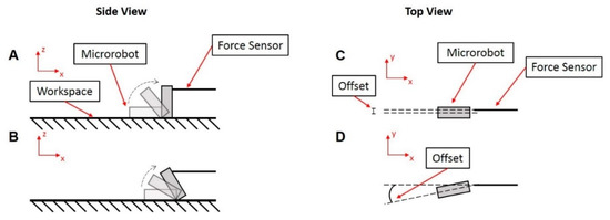 Force measurement was conducted in a static test case where the individual microrobot started from a rest position (performing a half rotation and then recording the force) and a dynamic test case where the microrobot was already in motion (performing several rotations and then recording the force). Additionally, for the dynamic tests, magnet rotation frequencies were alternated between 1.0 and 1.5 Hz to explore any potential effects from a difference in speed. Results show that the forces remained around the same range for all cases (from 2 to 10 μN) with a few force spikes getting over 30 μN (Table 4). Since the microrobot was manually aligned and subject to unpredictable surface forces, the microrobot did not always directly hit the force sensor resulting in the variance in the forces measured. Deviations from the ideal, straight-line contact caused variations in the resulting forces. Figure 7 outlines these deviations, showing the ideal contact position that results in the maximum force reading in Figure 7A and also the possible misalignment that contributes to the large variance in force results in Figure 7B–D. The puncture force for pig (liver and skin) and other animal tissues ranges from approximately 0.2 to 2 N [44], a force four orders of magnitude greater than the maximum force the microrobot is capable of applying. Thus, it can be concluded that the tumbling motion of the microrobots does not run the risk of tissue damage or puncture.