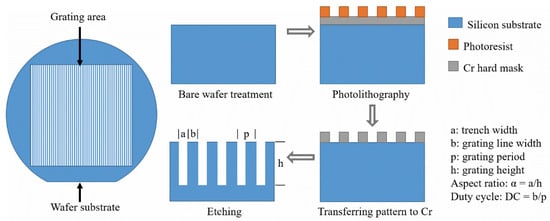 N-type silicon wafers with diameter of 100 mm and crystal orientation of <100> were chosen as the substrates for the grating fabrication. Wafers with lower resistances (0.001–0.01 Ω·cm) are preferred to facilitate the following gold electroplating process, for filling the silicon templates with highly absorbing X-ray materials in order to create the absorption gratings [26]. Either standard photolithography (for gratings with periods larger than 2 μm) or displacement Talbot lithography (DTL) (for gratings with periods smaller than 2 μm) [15] was used for preparing the pattern of grating lines. MICROPOSIT S1800 series positive photoresists were used for standard photolithography, and SUMIRESIST PFI-88A7 positive photoresist together with AZ Barli-II bottom anti-reflective coating (BARC) were used for DTL. The exposed pattern of grating lines was developed in Megaposit MF-24A developer. The transfer into the underlying layer of chromium was done by plasma etching, with Cl2 and O2 as etchant gases. The chromium layer served as a hard mask for the following silicon DRIE process. The thickness of the chromium layer varied from 50 nm to 130 nm, depending on the target height of the grating lines. Figure 1 illustrates the used procedure of grating fabrication.