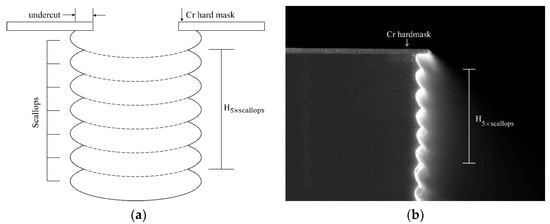 The DRIE process was realized in PlasmaLab100 ICP-type etcher from Oxford Instruments Plasma Technology, using C4F8 and SF6 as passivation and etching gases, at a fixed temperature of 0 °C. Scanning electron microscopy (SEM) with In-Lens detector of a Zeiss Supra VP55 was used to characterize the etched gratings in cross-section view. At the beginning of each process, the depths of the trenches are not very high, so we could assume that the etch rate is not yet affected by the ARDE effect. We therefore measured the initial etch rate in a simple way, as described below. Figure 2 shows a schematic (Figure 2a) and a SEM image of the scalloped etched profile (Figure 2b) and the measurement of the height corresponding to five etching loops.