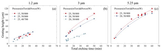 Grating height as a function of etching time for different grating periods: (a) 1.2 µm; (b) 3 µm; (c) 5.25 µm. The dots are raw experimental data, and the solid lines are best fits with modified Coburn–Winters model (Equation (5)).