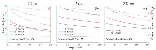 Solid lines: etch rate (R) as a function of aspect ratio (α) fitted with Equations (3)–(6); dotted lines: normalized etch rate (R/R0) for different grating periods: (a) 1.2 μm; (b) 3 μm; (c) 5.25 μm.