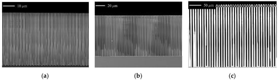 SEM images of cross-section of gratings. Grating period, height and aspect ratio: (a) p = 1.2 μm, h = 40 μm, α = 67; (b) p = 2 μm, h = 77 μm, α = 77; (c) p = 9.92 μm, h = 231 μm, α = 47.