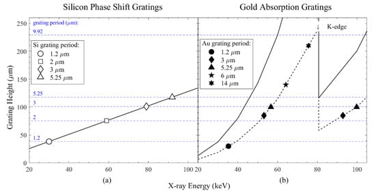 Figure 7 reports the calculated grating height as a function of X-ray energy by using Equation (6) for π-phase shifting Si gratings and Equation (7) for absorption gratings, where the Si templates are filled with Au. The attenuation length of Au is around 20 µm at 30 keV [47]; for higher X-ray energy, the data from NIST (National Institute of Standards and Technology) database [48] were used to compute the grating height of Au in Figure 7b.