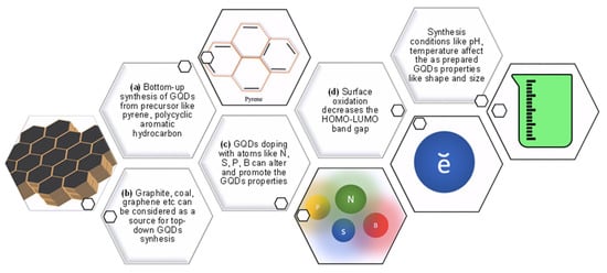 (a) Pyrene and polycyclic aromatic hydrocarbon along with other substances can be the precursor required for bottom-up GQDs synthesis [70,92]. (b) Several substances that can be the carbon source for top-down GQDs synthesis. (c) Doping graphene with heteroatoms, such as S, N, B, and P, can expertly manage a tunable gap in graphene’s energy spectrum and thus produce new phenomena, alter and improve properties of the dot [85,86,93,94]. (d) The size and the shape of the GQDs alter the energy levels of the highest occupied molecular orbitals (HOMO) and the lowest unoccupied molecular orbitals (LUMO) in correlation with the change of absorption spectra where the PL of GQDs are related to the passage from LUMO to HOMO levels. The band gap between HOMO-LUMO can also be decreased with the increase in surface oxidation of GQDs [95,96,97].