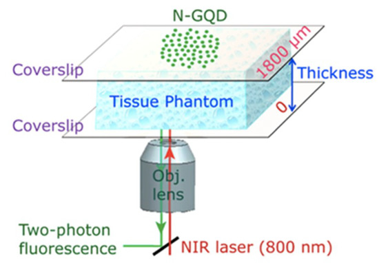 Schematic representation of the set-up used for TPFI of N-GQDs in tissue phantom with different thickness. TPFI is known for deep penetration into tissue with mitigated photo-damage during application. TPFI of N-GQD was analyzed using a NIR femtosecond laser as excitation and implemented for tissue imaging up to the penetration depth of 1800 μm. With negligible photo-thermal effects of N-GQDs, it was possible to use N-GQDs in TPFI on living cells with strong fluorescence [139].