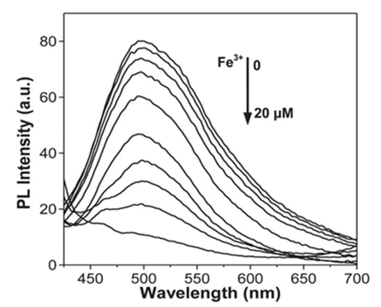 PL intensity changes due to the Fe3+ application on the quenching mechanism (λex = 400 nm). Fe3+ ions are indispensable, and it was hypothesized that GQDs can be a detector of Fe3+ since they have phenolic hydroxyl groups. These results indicate that luminescent GQDs can also be used to detect Fe3+ [70].