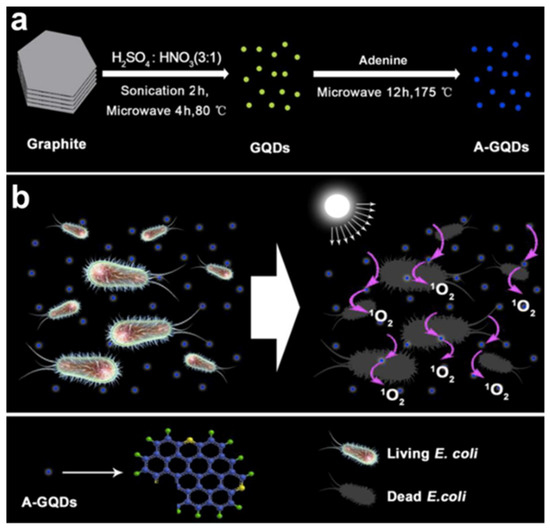 The bio-imaging activity of GQDs can also be considered along with their antibacterial property. In 2017, a study on adenine modified GQDs (A-GQDs) was reported, claiming for the first time that the synthesized QDs can be employed for the antibacterial applications under white light. Herein, A-GQDs were prepared by blending the bulk graphite and adenine (Figure 7). The synthesized A-GQDs were reported to be an exceptional in cell imaging due to their green TPFI property at an excitation wavelength of 750 nm. In this study, the human lung carcinoma A549 cells were selected as a test model, where the A-GQDs were shown to have high-grade biocompatibility and resulted into the cell viability at 94% after 24 h of incubation, which proved that A-GQDs could be the appealing candidates for further bio-imaging applications. The white light-activated antibacterial activity of A-GQDs against gram-positive S. aureus and gram-negative E. coli showed that there was nearly no significant proliferation and vital activity of E. coli, however S. aureus could stay alive without being affected by A-GQDs [61].