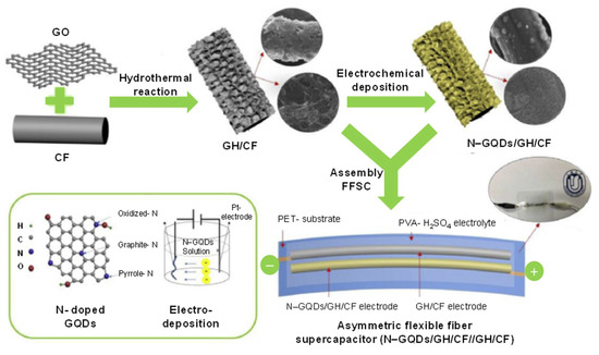 Carbon-based FFSCs are favorable power sources for wearable and portable electronic devices. A study reported the synthesis of N-GQDs/CF hybrids using graphene hydrogel (GH) [209]. This GH could serve as a 3D porous buffer layer, which was implanted on CF to obtain ternary carbon hybrid of N-GQD/GH/CF (Figure 11). Herein, N-GQDs with high pseudo-capacitive performance were electrochemically deposited on the GH/CF layer. Such a micro-supercapacitor could provide a volumetric capacitance of 93.7 F cm3 at 20 mA cm3, which was almost 7-fold more than that of the GH/CF, whereas the capacitance retention reached 88% after 5000 cycles. The improved performance and excellent flexibility of FFSCs can be attributed to the presence of N-GQDs in such a system [209].