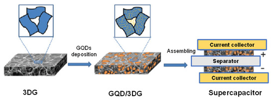 Combining 3D graphene (3DG) framework with other functionally active components increases the overall ability of micro-supercapacitors [236]. As presented in Figure 12, GQDs were electrochemically incorporated onto the 3DG framework. The researchers reported that such a highly stable MSCs system engineered from the GQD/3DG could exhibit high specific capacitance of 268 F g−1, which was 90% improved than those with only 3DG electrodes [234].