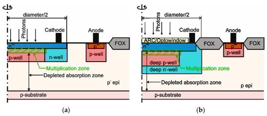 Cross sections (not to scale) of (a) single-photon avalanche diode (SPAD) type A in 0.35 µm standard CMOS with p- epi-layer and (b) SPAD type B in 0.35 µm high-voltage (HV) complementary metal-oxide-semiconductor (CMOS) with standard p epi-layer, deep p-well, and deep n--well for high-voltage applications (FOX = field oxide).