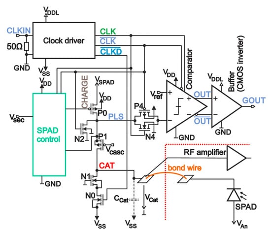 Block diagram of a clocked gating control chip, where a SPAD is connected with a bond wire. A radio frequency (RF) amplifier measures the cathode voltage via a RF probe needle on the pad at node cathode node (CAT).