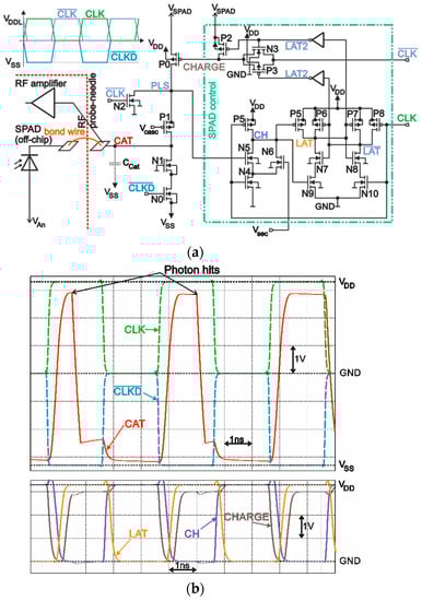 SPAD control in the gating control chip: (a) Schematics; (b) Simulated transients assuming a fast responding SPAD. A photon hit triggers an avalanche in the SPAD, which discharges node CAT until the cathode-anode voltage reaches its breakdown voltage and the avalanche is quenched.
