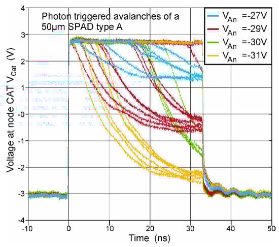 Transients of the cathode voltage (node CAT) of a SPAD type A with a diameter of 50 µm for different anode voltages VAN. In the illustration, transients of several active phases are overlaid. It can be seen that early avalanches quench (themselves) during the active phase, when the breakdown level is reached. Some avalanches, which occurred later in the active phase are quenched by the following reset phase. The observed breakdown level in this figure depends on the anode voltage VAN. It can be calculated with the breakdown voltage as VAN + VBD.