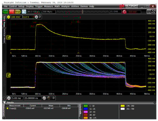 With lots of samples of avalanche transients, which happened approximately in the first quarter of the active phase, an 80 to 20% fall time could be measured for the different SPADs. For this, the SPAD was illuminated with a halogen light so that the photon hits on the SPAD were somewhat equally distributed over the time duration of the active phase when overlaying several cycles with a storage oscilloscope as, e.g., depicted in Figure 5 for a SPAD type B with 48.2-µm diameter for an anode voltage of −66 V. When considering an ideal exponential decay of the excess bias, the time constant τ can be calculated by dividing the 80 to 20% fall time by ln(4).