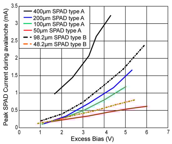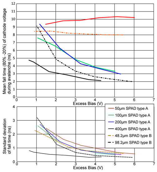 Figure 6 shows the results for the different types of SPADs. There is a tendency that SPADs of type B in the HV CMOS technology are somewhat faster than SPADs of type A due to more avalanche current. The reason could be that for SPAD type B in HV CMOS technology deeper wells with a tendency to lower doping are used to meet requirements of high-voltage operation, which increases the breakdown voltage. This may result in a vertical thinner p epi layer (thinner absorption zone) below the SPAD type B, which in combination with the deep n-well increases somewhat the field in the depleted absorption zone. For SPADs with a diameter larger than 98.2 µm, a drop of the fall time was observed (meaning the avalanche build-up is faster) when the excess bias was increased, where the avalanche current got larger.