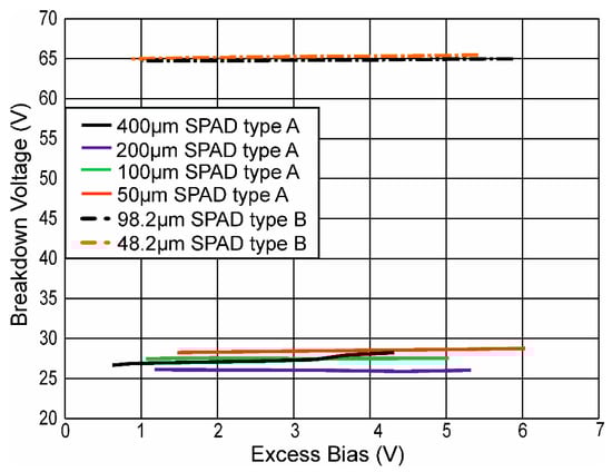 For those avalanche transients, which could reach the breakdown level before the end of the active phase, the breakdown voltage VBD was determined from the breakdown level VBL from the relationship VBD = VBL-VAN. In Figure 7, the results of the breakdown voltage for several SPADs versus the excess bias are depicted. All breakdown voltages were mostly independent from the excess bias (as expected). The small variation for SPAD type A with 400-µm diameter were originated from the gating chip, which came due to the larger capacitance of the SPAD to its operation limit. The measured breakdown voltages amounted to 28.5, 27.5, 26, and ≈27 V for SPAD type A with 50, 100, 200, and 400 µm, respectively. For SPAD type B breakdown voltages of 65.2 and 64.8 V, they were determined for diameters of 48.2 and 98.2 µm, respectively.