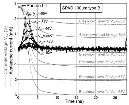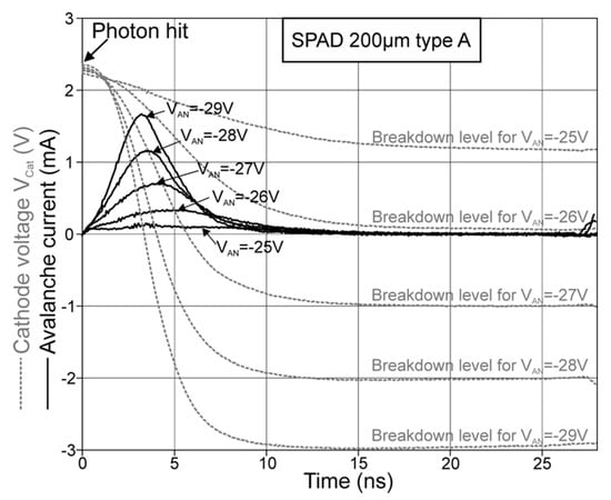 In Figure 8, there is a considerable shift of the peak current towards larger time points from 3 ns to almost 5 ns when changing the anode voltage from −29 to −26 V. For −25 V, noise influences the current transient. In Figure 9 the shift of the peak current occurs to a less extent. This can be explained, if the range of the excess bias from 0 to 6.6 V is seen in relation to the breakdown voltage, which was lower for the 200-µm SPAD type A with 26 V than for the 98.2-µm SPAD type B with 64.8 V. Therefore, the same excess bias caused a larger increase of the electric field in the multiplication region of SPAD type A than in SPAD type B.