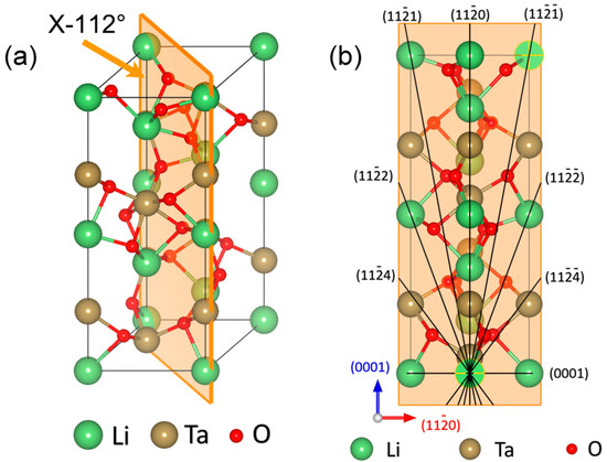 (a) Schematic illustration of atomic arrangements of LiTaO3 single crystal, the X-112° plane (102) is depicted. (b) Slip system perpendicular to the X-112° plane.