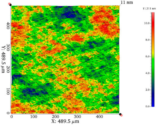 A LiTaO3 single crystal belongs to the trigonal R3c space group with ion bonding structure and is commonly depicted by a hexagonal axis. Figure 1a shows the schematic illustration of the atomic arrangement of a LiTaO3 single crystal and the typical orientation (102) also known as X-112° plane. The slip system perpendicular to X-112° plane was exhibited in Figure 1b. Prior to nanoindentation, the X-112° plane was carefully polished to a mirror surface, of which roughness Ra was lower than 1 nm. Diamond abrasive at the average size of 2 um (8000#) and polyurethane polish pad were adopted on the Nanopoli-100. After 45-min polishing, LiTaO3 samples were carefully cleaned in the anhydrous alcohol by ultrasonic cleaning [33]. Top view of surface morphology was observed by an optical 3D surface profilometer (Talysurf i-Series) on the area of 500 × 500 μm2 as exhibited in Figure 2, by which the surface roughness Ra could be measured.