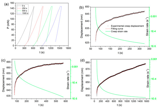 (a) Typical P-h curves of load-holding tests with various duration and the time-dependent plastic deformations were plotted as a function of holding time (b) 250 s, (c) 500 s and (d) 1500 s. An empirical law was adopted to fit the creep curves and the corresponding strain rate could be deduced. Both creep fitting line and strain rate were plotted as a function of holding time.
