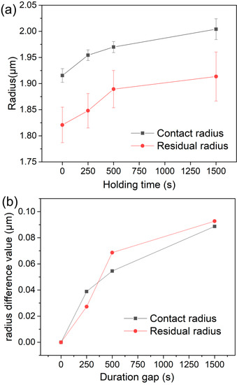(a) The residual radii measured from scanning electron microscope (SEM) observation and the contact radii at the end of holding stage, which were plotted with holding time. (b) The increased values of contact and residual radii after holding stage.