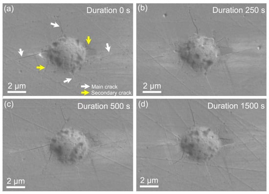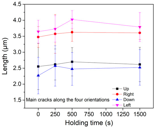 From the SEM images, it could be seen that symmetric cracks of several micrometers in length appeared along four directions with an angle of 90 degrees, as indicated by white arrows in Figure 5a. Here, we defined these primary cracks as the main crack. According to the slip system perpendicular to X-112° in Figure 1b, the (120) and (0001) might be the slip planes during nanoindentation deformation. Besides, several tiny cracks could also be observed, of which orientations were disordered as indicated by yellow arrows. The four main cracks appeared in all the residual impressions, thus its total count was constant. As exhibited in Figure 6a, the total count of secondary cracks in sixteen tests was dramatically increased from 27 to 40 after 250 s holding, and then secondary cracks were slowly increased from 40 to 47 by increasing holding time to 1500 s. Figure 6b shows the mean lengths of main and secondary cracks, which were both increased about 100 nm after 250 s holding and nearly invariable by further increasing holding time. In addition, mean lengths of the main cracks along four orientations were summarized in Figure 7. All the main cracks followed a similar variation trend with increasing holding time as shown in Figure 6b, which further illustrated a uniform extension of cracks during holding stages. According to statistical results in Figure 6, the main mechanisms of time-dependent plastic deformation in LiTaO3 on the three holding stages could be qualitatively unfolded, relying on the length evolution of pre-existing main cracks and generation of new secondary cracks.